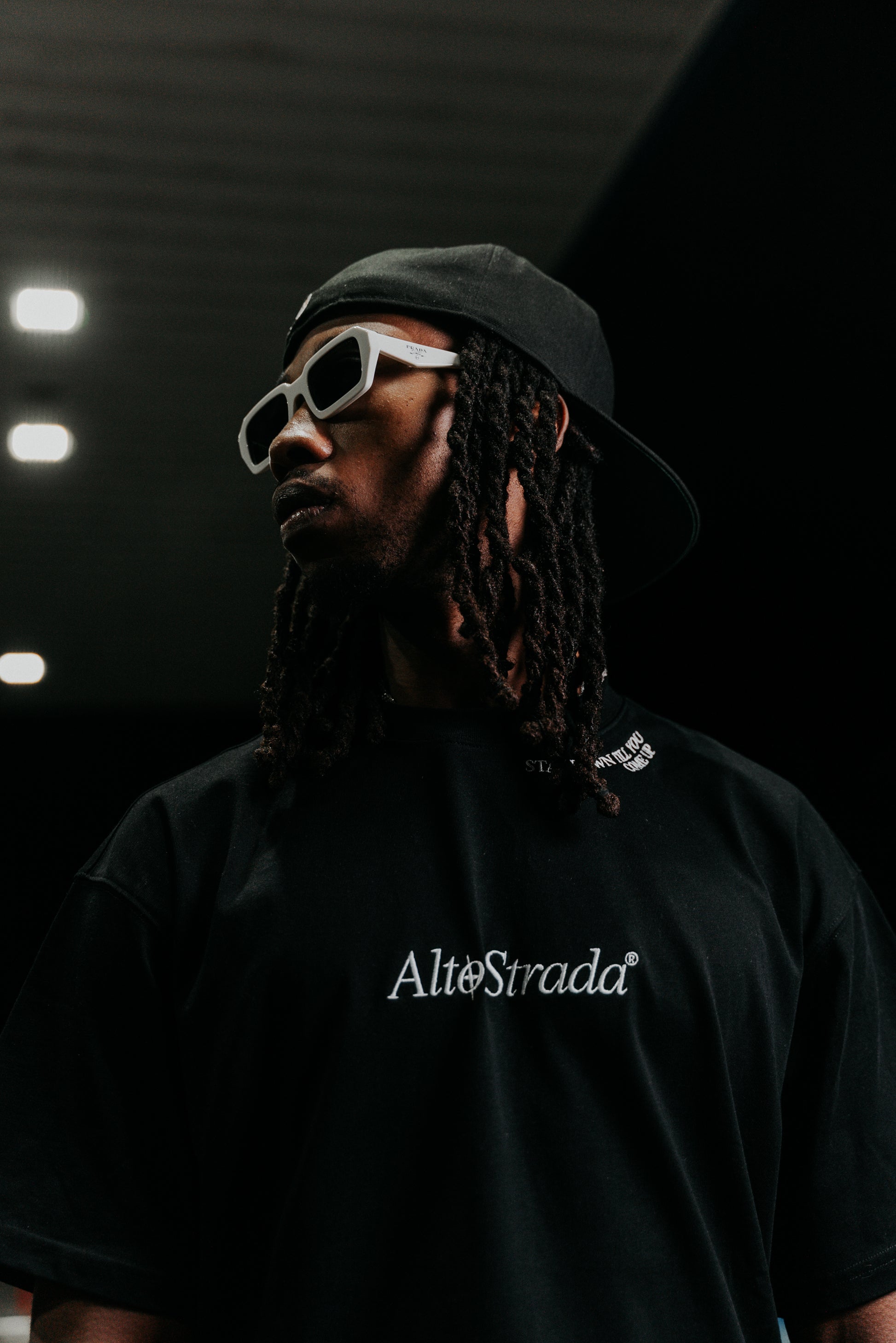 Heavyweight 275 GSM cotton T-shirt with an oversized drop-shoulder fit. White front embroidery logo, embroidered neck phrase, and puff-printed numbers on the back. Built for structure, weight, and everyday wear.